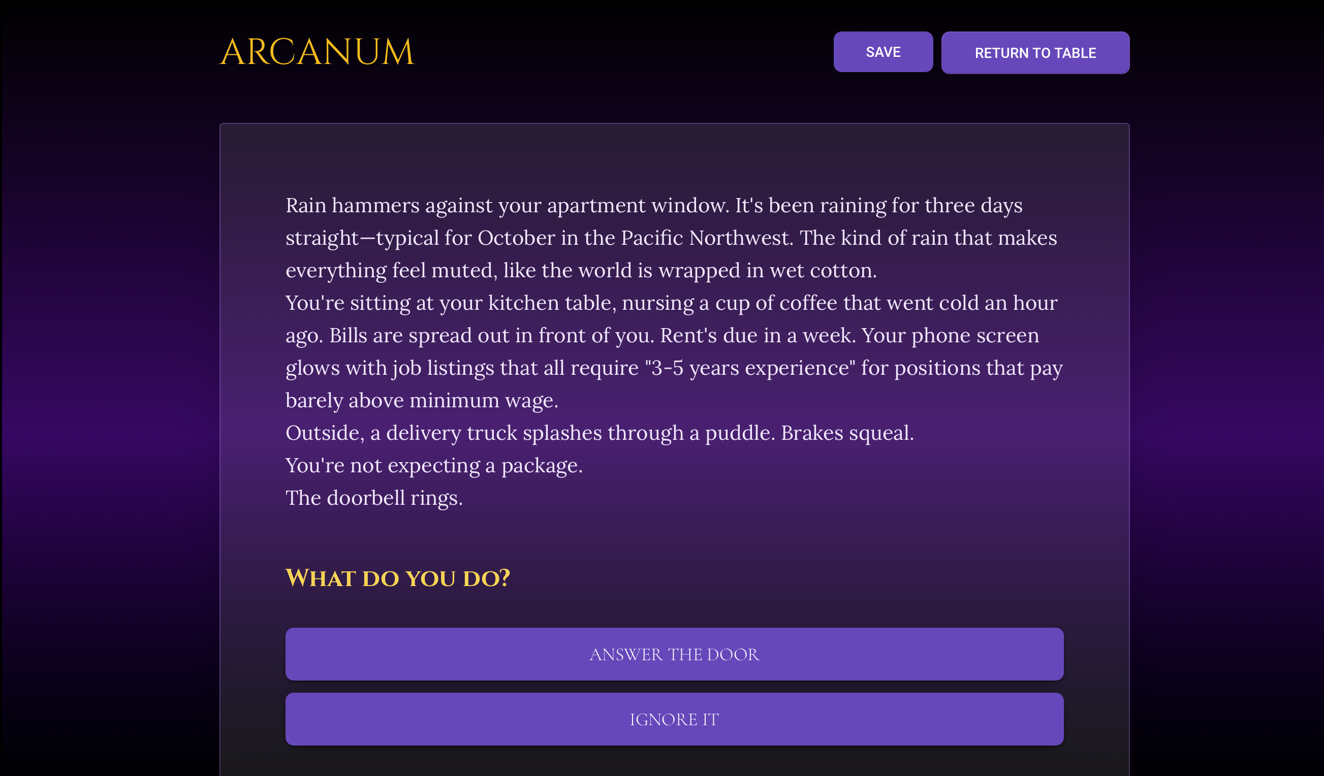 Arcanum is a literary, character-driven game about becoming a professional tarot reader in a "quietly weird," not-quite-Seattle. Your job isn't to save the world; it's to read cards for clients, each with their own deep, branching, multi-session arcs. Your interpretations matter. Your guidance will change their lives—for better or worse.